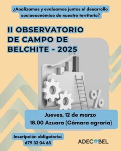 La Asociación para el Desarrollo de la Comarca de Belchite (ADECOBEL) invita a participar en una nueva sesión del Observatorio del Campo de Belchite, un espacio de encuentro y reflexión abierto a la ciudadanía, agentes sociales y entidades locales para analizar conjuntamente la situación y el progreso de la comarca. La cita será el jueves 12 de marzo a las 18:00 horas en la Cámara Agraria de Azuara, situada en la Avenida San José, 31.