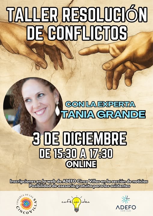 ADEFO Cinco Villas, en colaboración con la Comarca de las Cinco Villas, celebrará el próximo 3 de diciembre de 15:30 a 17:30 horas un nuevo taller del ciclo Café con Idea, dedicado a la resolución de conflictos en el entorno laboral. La sesión, que se desarrollará en formato online, está dirigida a empresarios, responsables de equipos y profesionales que deseen mejorar su capacidad para gestionar situaciones conflictivas.