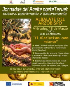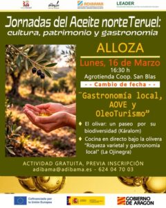 La Asociación para el Desarrollo Integral del Bajo Martín y Andorra-Sierra de Arcos (ADIBAMA) ha organizado las Jornadas del Aceite Norte Teruel: Cultura, patrimonio y gastronomía, una iniciativa enmarcada en el proyecto de cooperación ‘Pon Aragón En Tu Mesa’. El objetivo es profundizar en el conocimiento del aceite de oliva, producto de gran arraigo en el territorio, para poner en valor el patrimonio que lo rodea y explorar las nuevas oportunidades que ofrece el #OleoTurismo.