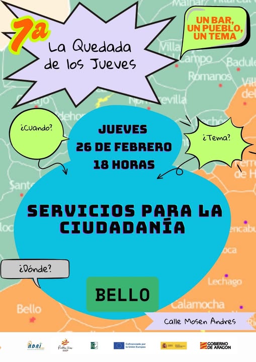El pasado jueves, 26 de febrero, Bello acogió la séptima cita de La Quedada de los Jueves, un ciclo de encuentros celebrado bajo el lema «Un bar, un pueblo, un tema». La actividad, enmarcada en el proyecto de cooperación Pueblos Vivos Aragón es organizada por ADRI Jiloca Gallocanta.