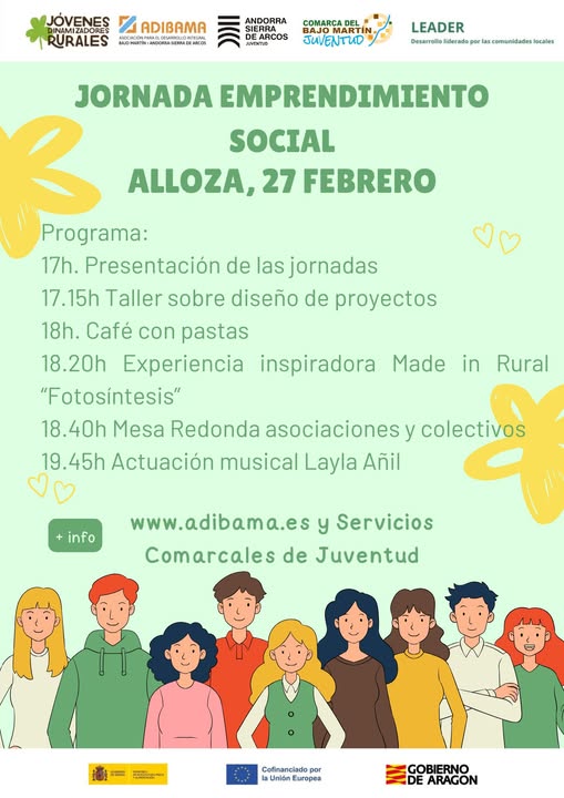 El próximo jueves, 27 de febrero, la localidad de Alloza se convertirá en el punto de encuentro de la dinamización rural con la celebración de la ‘Jornada de Emprendimiento Social’, una cita dirigida a entidades, colectivos y jóvenes de las comarcas de Andorra-Sierra de Arcos y el Bajo Martín. La iniciativa del grupo de acción local ADIBAMA , enmarcado en el proyecto ‘Jóvenes Dinamizadores Rurales’, busca reflexionar y actuar sobre el asociacionismo y el desarrollo del territorio de una forma práctica.