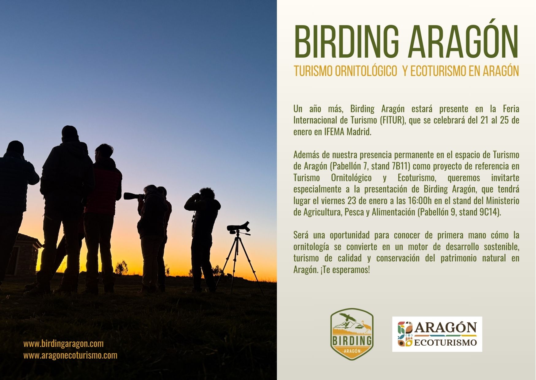 BIRNDING ARAGÓN participa desde el 21 hasta el domingo 25 de enero en la Feria Internacional de Turismo (FITUR) que se celebra en IFEMA Madrid. La iniciativa, que tiene su espacio dentro del stand de Turismo de Aragón (Pabellón 7, Stand 7B11), busca promocionar la riqueza ornitológica de la comunidad autónoma como un producto de ecoturismo y turismo de naturaleza de primer nivel.