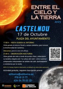 Este viernes 17 de octubre, Castelnou celebrará una nueva actividad del programa «Entre el Cielo y la Tierra» que permitirá a los participantes explorar tanto los valores naturales del entorno como los secretos del cielo. La jornada organizada por el grupo de Acción Local ADIBAMA junto a la asociación CAELUM comenzará a las 17:00 horas en la Plaza del Ayuntamiento con una visita guiada por el entorno fluvial y campos aledaños de la mano de Ricardo de Káralom, para descubrir la biodiversidad local.