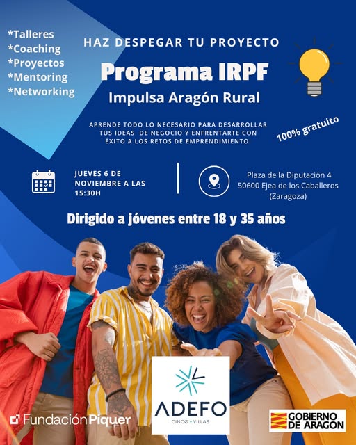 El próximo miércoles 6 de noviembre, ADEFO Cinco Villas acogerá en su sede de Ejea de los Caballeros una jornada informativa sobre el Programa Impulsa Aragón Rural. La sesión, dirigida a jóvenes de 18 a 35 años, se celebrará a las 15:30 horas en la Plaza de la Diputación, 4.