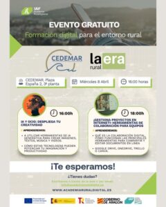 El próximo miércoles 8 de abril, la sede de CEDEMAR en Caspe (Plaza España 2, 3ª planta) acogerá una doble sesión formativa gratuita dirigida a personas del entorno rural interesadas en adquirir competencias digitales prácticas. La actividad, organizada por La Era Rural y CEDEMAR en colaboración con Academia Rural Digital, se desarrollará a partir de las 16:00 horas con dos talleres consecutivos.