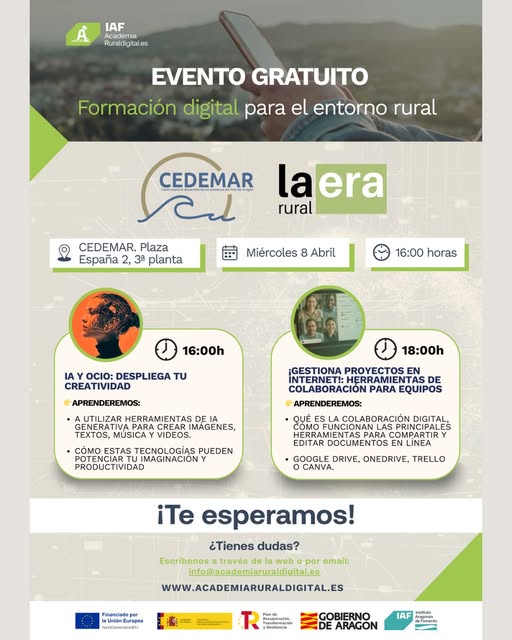 La iniciativa, enmarcada en el proyecto de Academia Rural Digital, busca acercar la formación tecnológica a los municipios aragoneses y reducir la brecha digital en el medio rural. Las personas interesadas pueden inscribirse de forma gratuita a través de www.academiaruraldigital.es/inscripcion, utilizando el código de referencia CEDEMAR en el apartado correspondiente del formulario.
