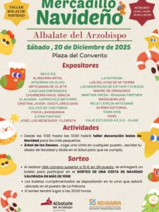 La localidad de Albalate del Arzobispo celebrará la tercera edición de su Mercado Navideño este próximo sábado 20 de diciembre. La Plaza del Convento se transformará en un espacio lleno de ambiente festivo, dedicado al disfrute familiar y al apoyo al comercio y la producción local.