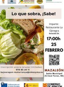El próximo 25 de febrero, a las 17:00 horas, el Salón Municipal de Mazaleón acogerá el taller «Lo que sobra, ¡sabe!», una iniciativa práctica enmarcada en el proyecto ‘Pon Aragón en tu mesa’ de OMEZYMA. Impartido por el Restaurante La Ojinegra, referente gastronómico del territorio, el curso de dos horas de duración enseñará a los participantes a aprovechar al máximo los alimentos y transformar los restos en recetas deliciosas, contribuyendo así a reducir el desperdicio alimentario.