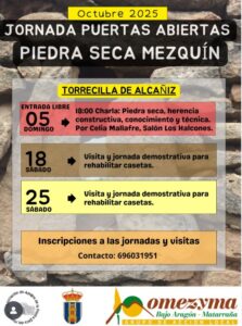 Paralelamente a esta cooperación interterritorial, OMEZYMA continúa colaborando con una intensa agenda cultural en el Bajo Aragón y Matarraña. Entre sus próximas actividades destaca la «Ruta de los sonidos de las masadas» en Valmuel (28 de septiembre), un paseo que combina naturaleza, historia y cine al aire libre con la proyección de Cinecicleta. Asimismo, el Coro Ciudad Alcañiz ofrecerá el concierto «Canciones inolvidables» en Belmonte de San José (27 de septiembre). Durante todo el mes de octubre, Torrecilla de Alcañiz acogerá las Jornadas de Puertas Abiertas de Piedra Seca, organizadas por la asociación local con apoyo de OMEZYMA, que incluirán charlas formativas y talleres prácticos de rehabilitación de construcciones tradicionales, demostrando el compromiso del grupo por preservar y dinamizar el patrimonio cultural de la zona.