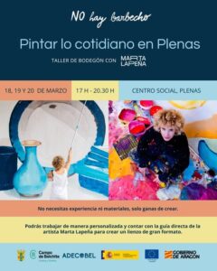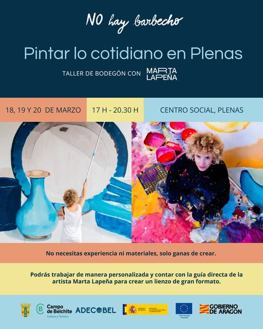 Los días 18, 19 y 20 de marzo, el Centro Social de Plenas se convertirá en un estudio de pintura colectiva con la celebración de un taller de bodegón impartido por la artista Marta Lapeña, en el marco del proyecto «No hay barbecho» que impulsa la Comarca Campo de Belchite y en la que colabora Adecobel. La iniciativa, que busca llenar de arte y memoria los pueblos del territorio, ofrece a los participantes la oportunidad de crear su propio bodegón en gran formato a partir de objetos cotidianos, con acompañamiento personalizado y sin necesidad de experiencia previa ni materiales.