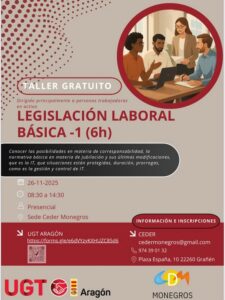 UGT Aragón, en colaboración con CEDER Monegros, impartirá el 26 de noviembre un taller gratuito de «Legislación Laboral Básica» dirigido especialmente a personas trabajadoras en activo. La formación presencial, que se desarrollará de 08:30 a 14:30 horas en la sede de CEDER Monegros en Grañén, abordará aspectos esenciales como corresponsabilidad, conciliación, jubilación y sus modificaciones recientes, así como la gestión completa de la Incapacidad Temporal.